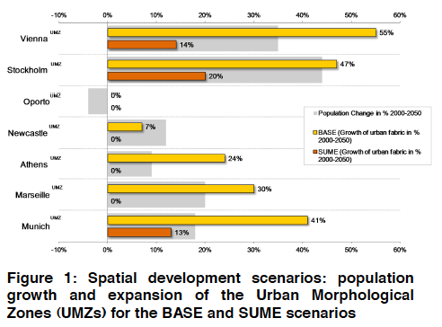 The results demonstrate that, even in a future agglomeration development using all available technological improvements, there is a large differential between a BASE- and a SUME-type development: A higher replacement or renovation rate of buildings and a better spatial focus of new developments with respect to public transport accessibility will reduce energy con­sumption by 30 to 40%. Only in special situations like in Oporto, where relatively small changes are anticipated for both components, i.e. buildings and transport, will the differ­ential between the BASE and SUME scenarios be less than 10%.