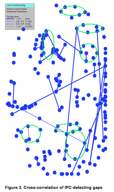 We are working on creating multiple technological maps. For example, there have been several analyses of the patent applications downloaded from the Derwent database. Figure 3 shows a result obtained after the cross-correlation of the individuals (patents) in a two dimensional space according to similarity of the International Patent Classification limited to four digits, ergo according to their technological contents. IPC is used to assign them to a similar technology group. Then we used the maps to identify patent clusters and areas where patents are lacking. The green ellipses drawn in Figure 3 represent the gaps where there are no patents.